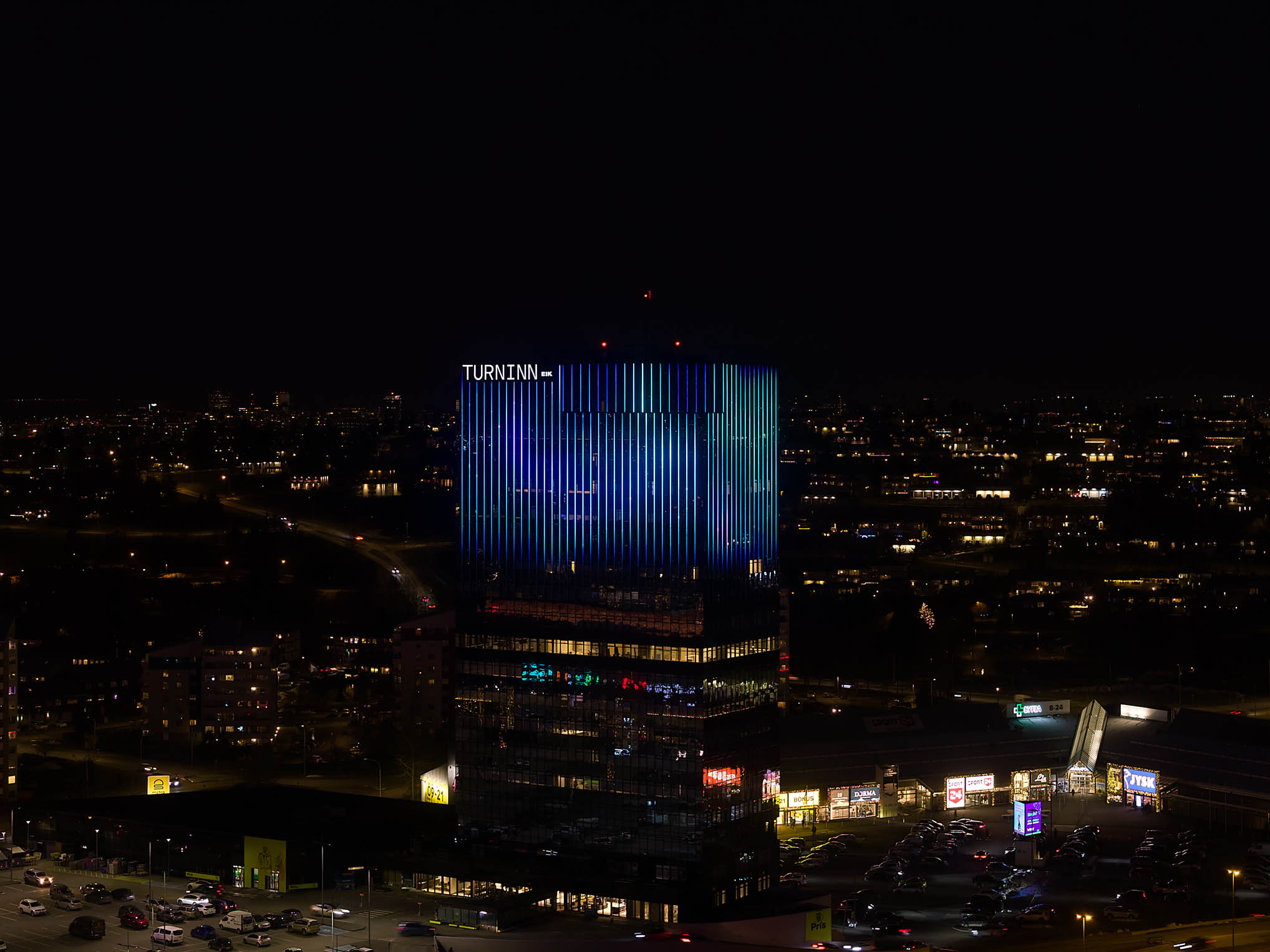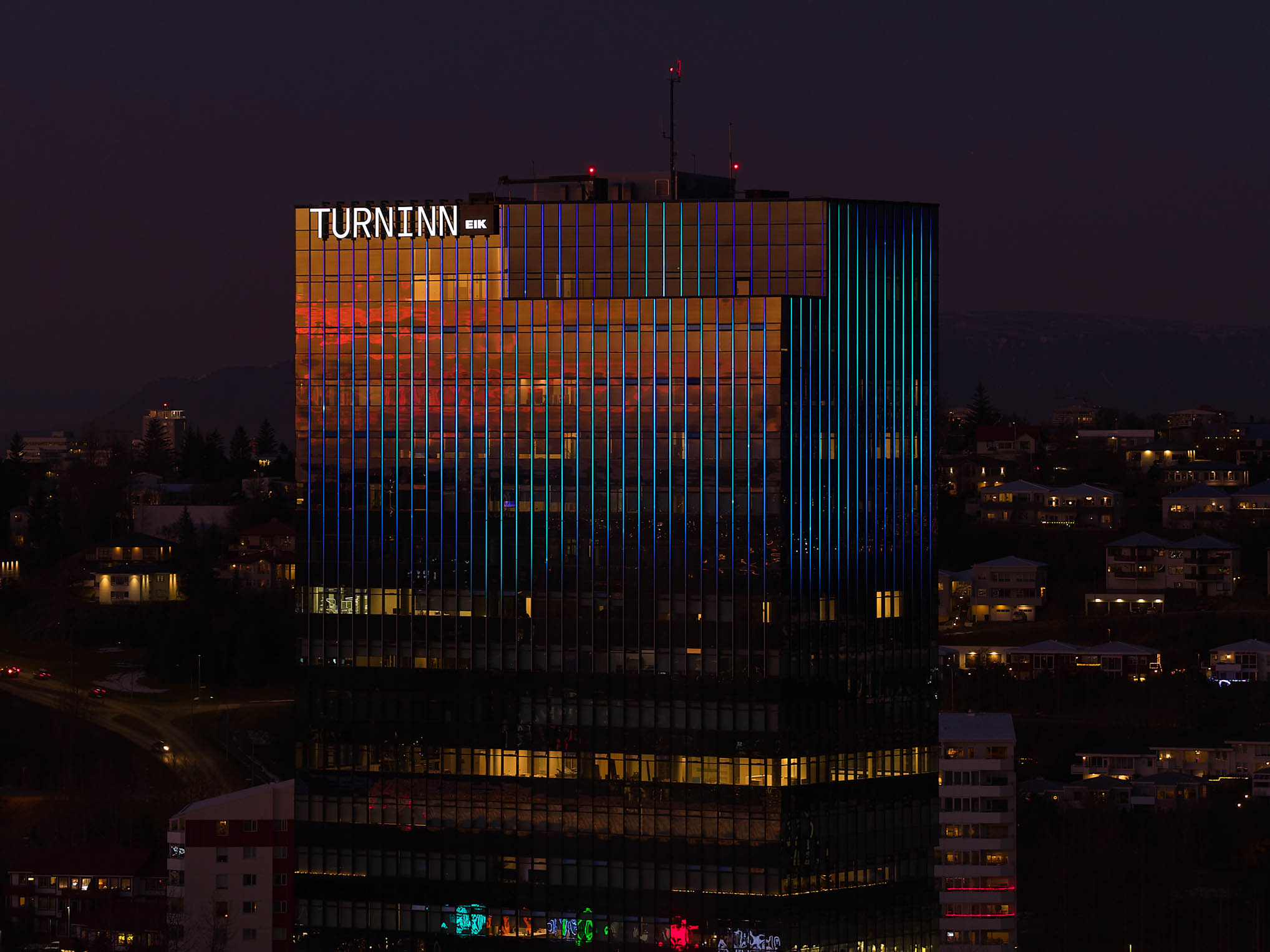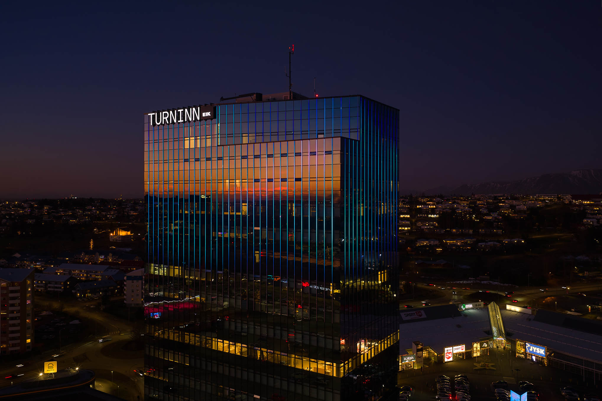 Lýsing glerhjúpsins er hluti af endurbótaverkefni á Turninum við Smáratorg. Markmiðið var að skapa kennileiti við sjóndeildarhringinn.