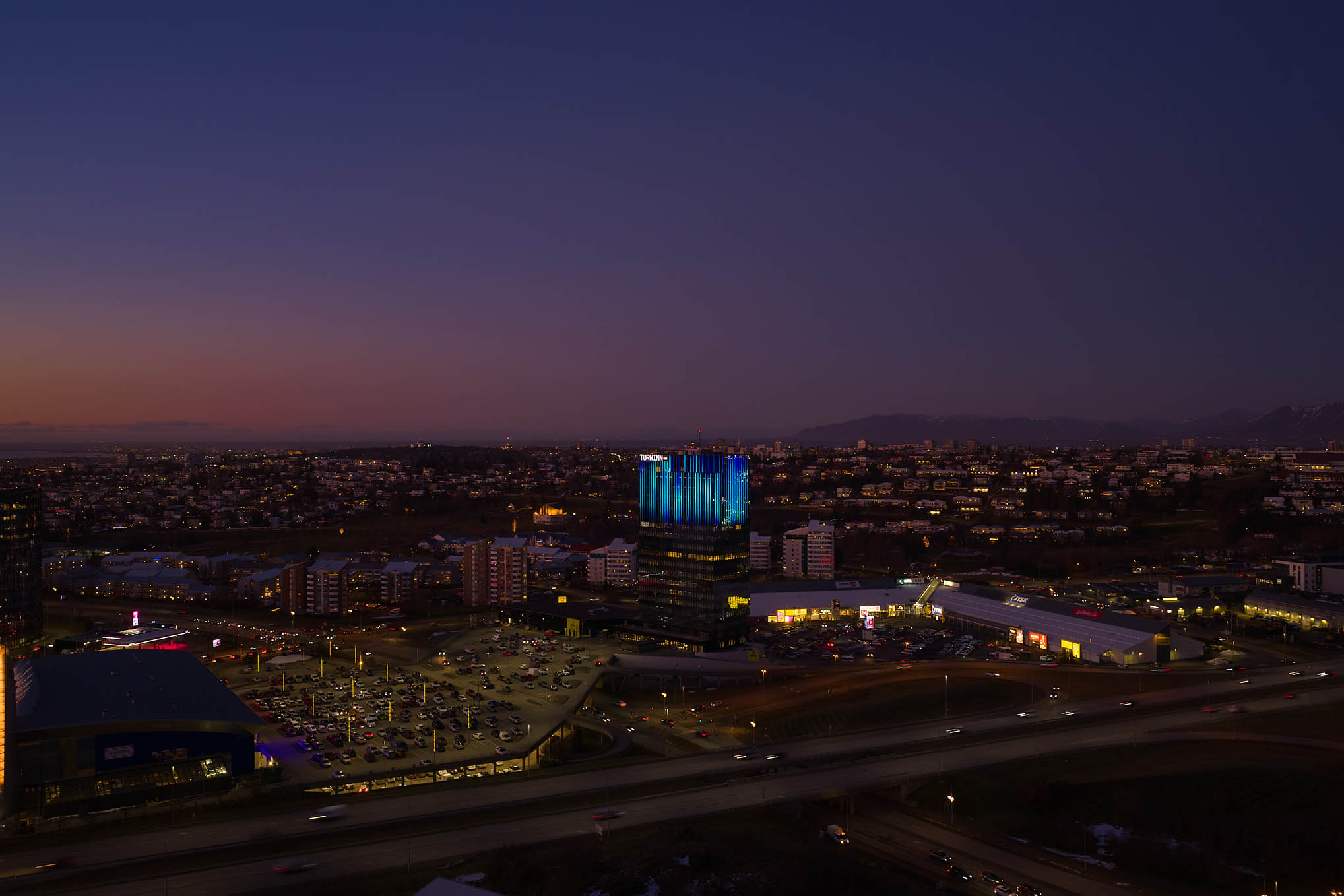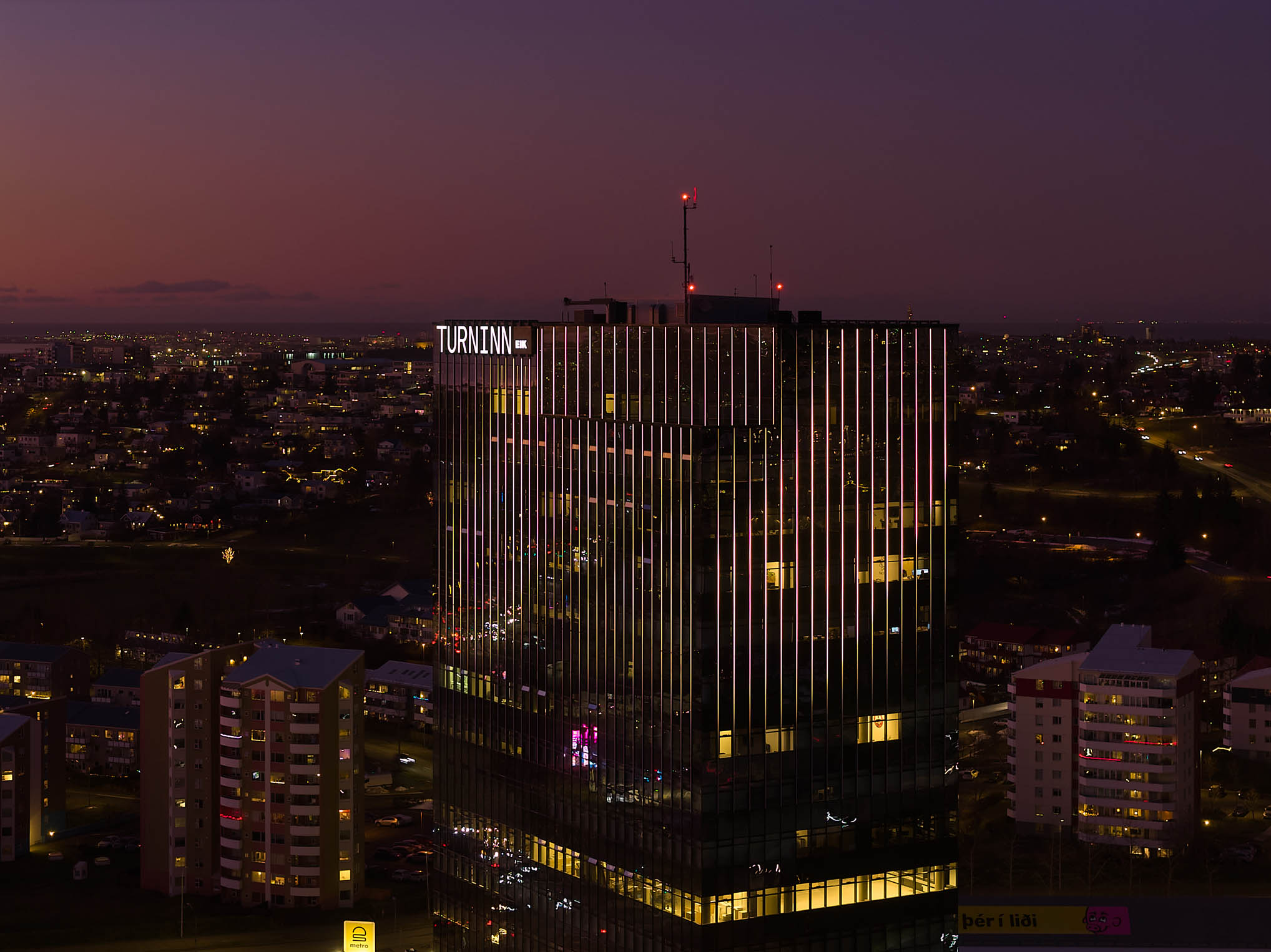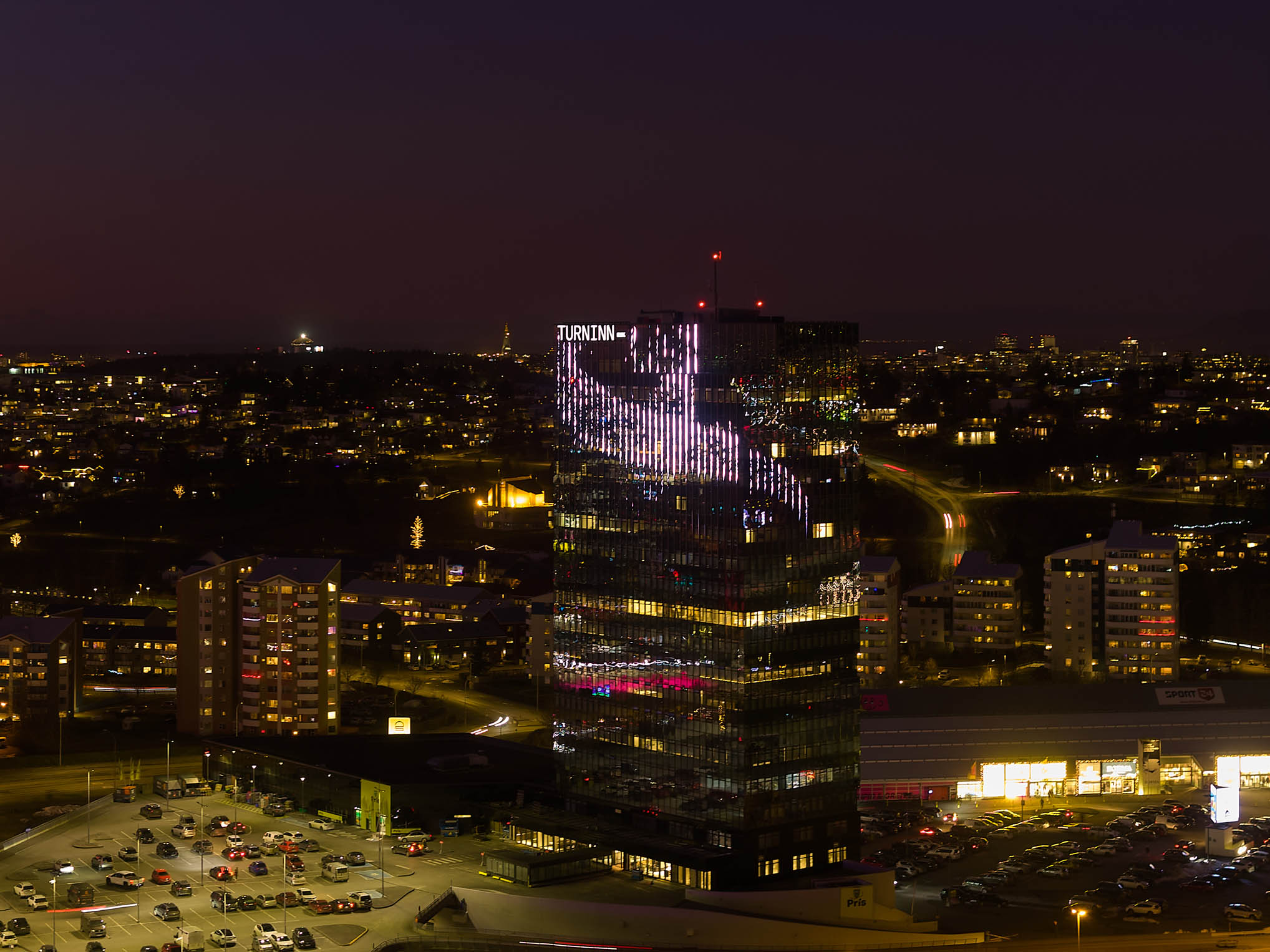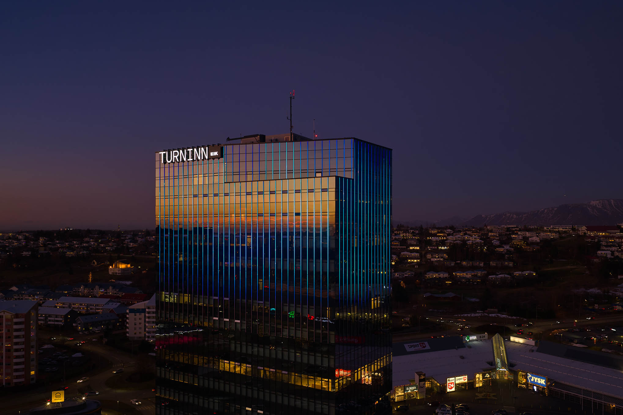 Lýsing glerhjúpsins er hluti af endurbótaverkefni á Turninum við Smáratorg. Markmiðið var að skapa kennileiti við sjóndeildarhringinn.