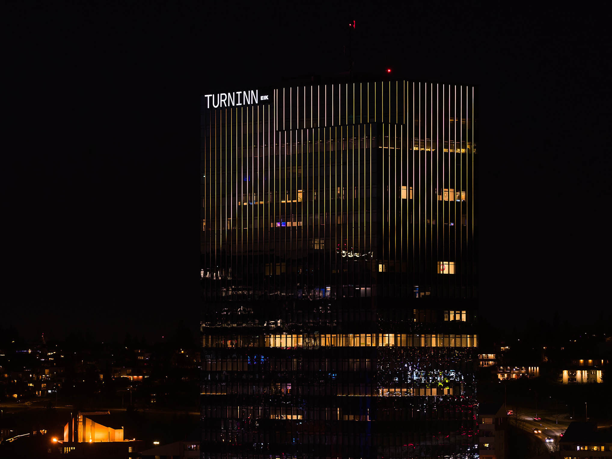 Í upphafi leitaði Eik fasteignafélag til fimm fyrirtækja og óskaði eftir verðtillögum og hugmyndum fyrir lýsingu á ytra byrði Turnsins og varð tillaga Exton fyrir valinu. Nú nokkru síðar má sjá einstaka og vel hannaða útkomu sem gerir þessa fallegu byggingu að kennileiti er vekur aðdáun.