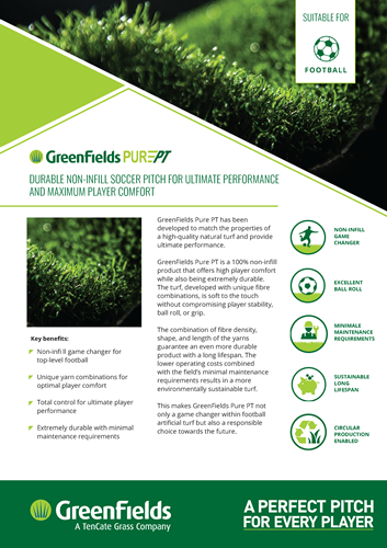 Einstök þráðatækni tryggir mjúkt en stöðugt yfirborð með náttúrulegri og eðlilegri boltahegðun,  eðlilegu gripi sem gerir upplifun leikmanna einstaka og lágmarkar meiðslahættu. Með hárréttum þéttleika þráða, áferð og efnasamsetningu, tryggir GreenFields Pure PT gervigras langvarandi endingu með lágmarks viðhaldsþörf. Þetta gerir Pure PT að afar hagkvæmum og umhverfisvænum valkosti fyrir íþrótta- og sveitarfélög sem uppfyllir allar nútímakröfur og framtíðarskilyrði sem sett hafa verið af FIFA. Nýjung sem uppfyllir reglugerð KSÍ um keppnisvelli í öllum deildum á Íslandi. Lausn sem uppfyllir FIFA Quality staðalinn. Til að fá völl vottaðan sem FIFA Quality völl þarf að bæta við mulnum olívusteinum í völlin til málamynda, þar til staðlinum hefur verið breytt.